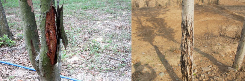 于各種針、闊葉林,多由真菌引起。被害枝、干的樹皮局部變褐、發(fā)軟,最后壞死、干裂或下陷,枝干被病斑環(huán)繞一周后枯死。如林木抗病力增強,病斑外圍可形成愈傷組織,限制病菌擴展。板栗疫病是最嚴(yán)重的森林病害之一。病菌主要通過細(xì)小傷口侵入,在枝干上引起典型的爛皮病斑,剝開病皮可見扇形菌絲片。