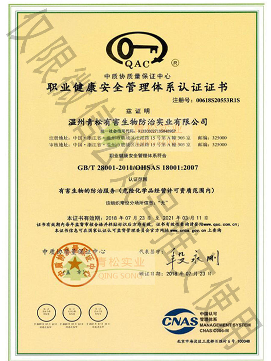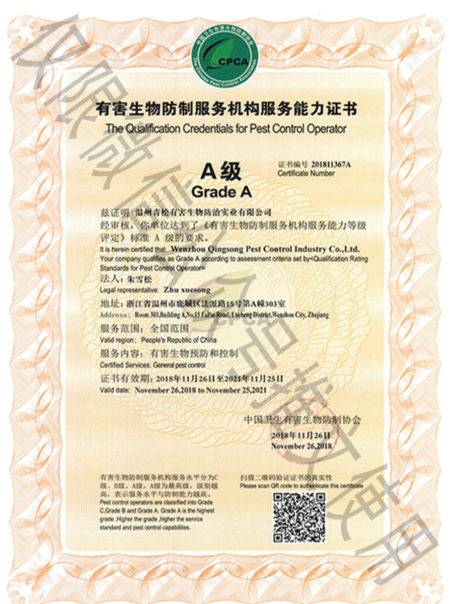 國家級有害生物防制認證機構(gòu)A級證書/浙江省病媒生物防制服務(wù)機構(gòu)能力等級一級資質(zhì)