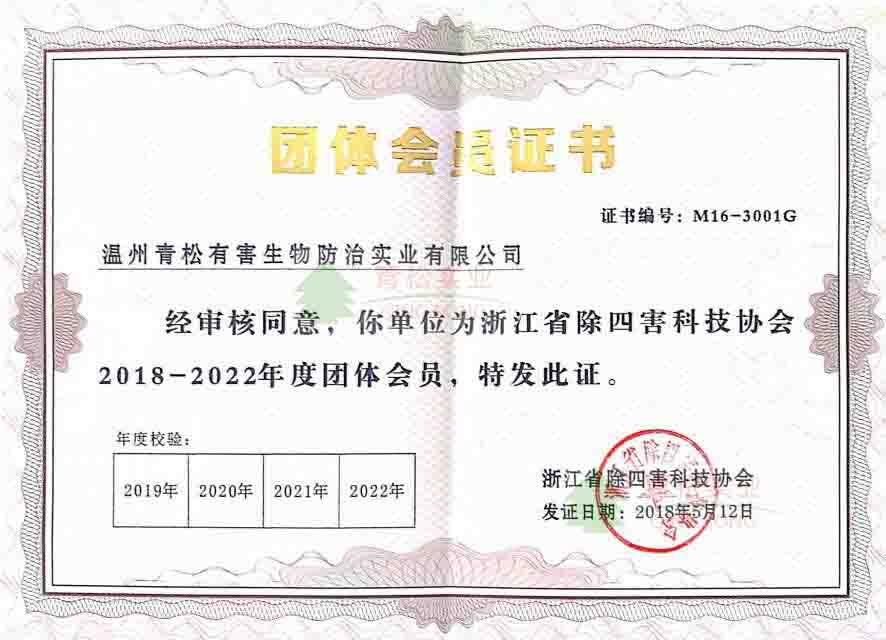 中國衛(wèi)生有害生物防治協(xié)會團(tuán)體會員證證書