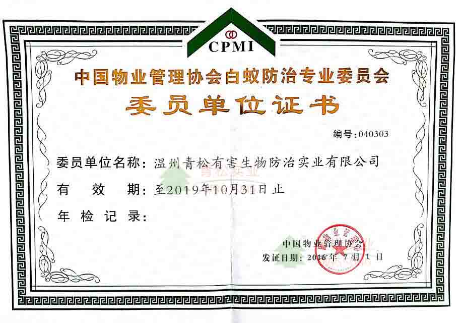 中國物業(yè)管理協(xié)會白蟻防治專業(yè)委員會委員單位證書