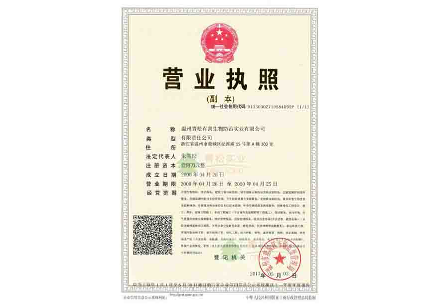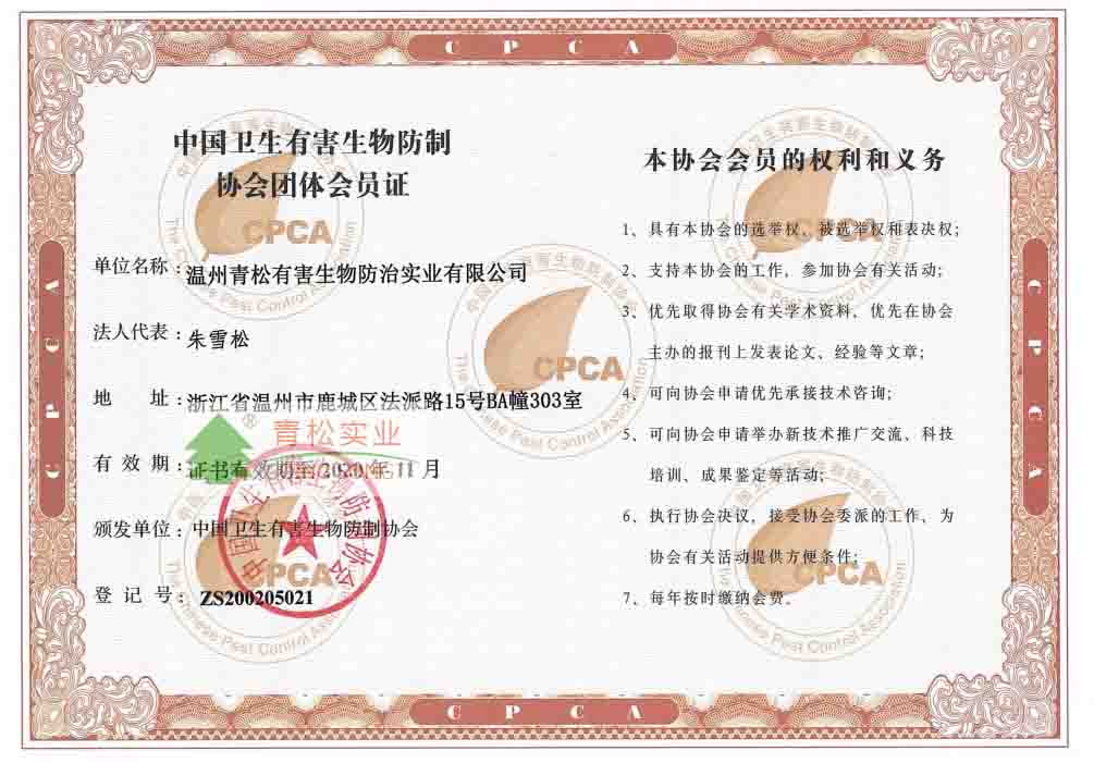 版權(quán)所有:溫州青松有害生物防治實業(yè)有限公司 地址:浙江省溫州市甌海區(qū)新橋街道高翔工業(yè)區(qū)大地路1號第4棟4-5層